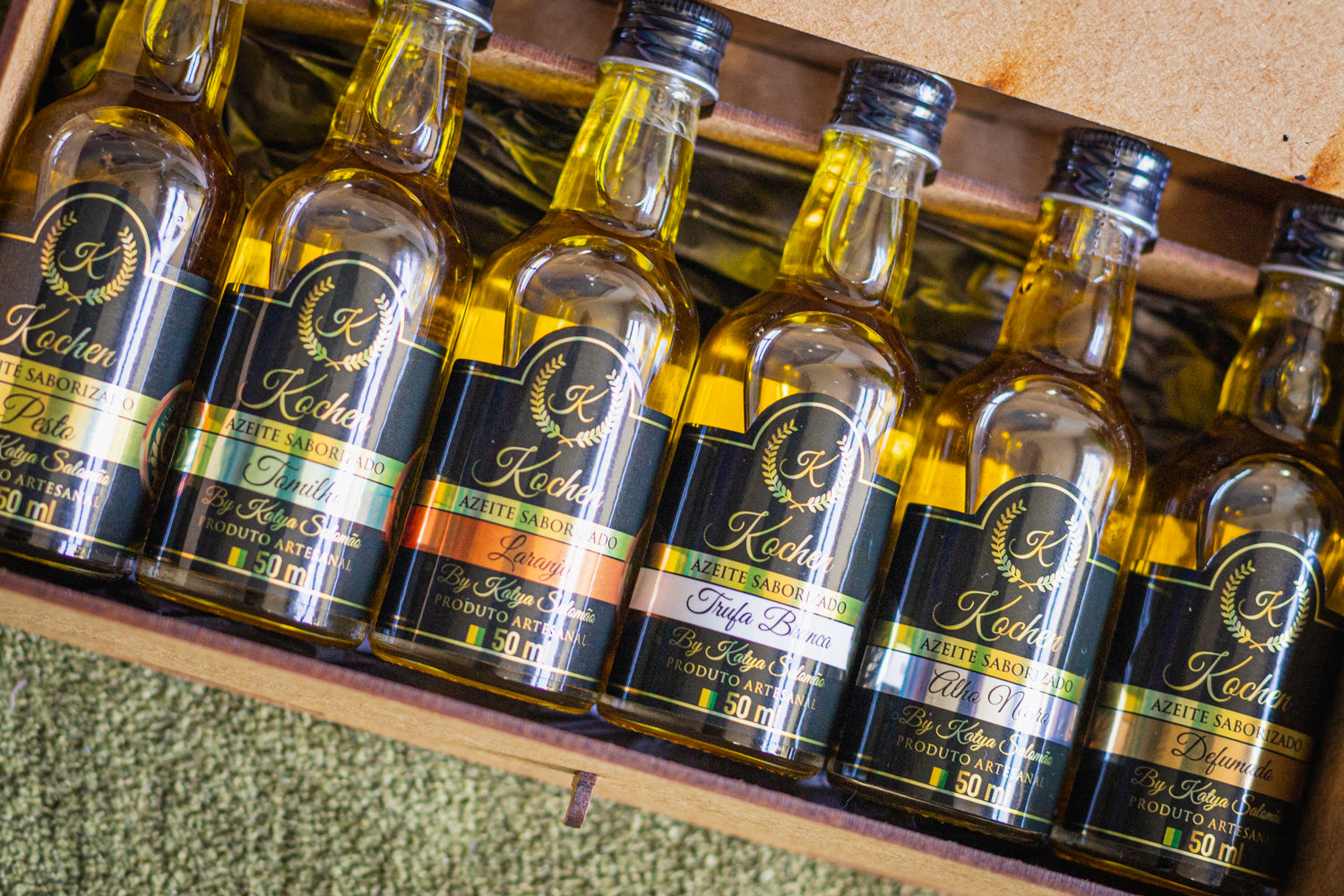 Explore o universo dos azeites Kochen com o nosso Mini Kit campeão de vendas! Com 6 azeites de 50ml, você pode personalizar sua seleção entre os sabores clássicos e os premiados no EVO IOOC 2022, 2023 e 2024.